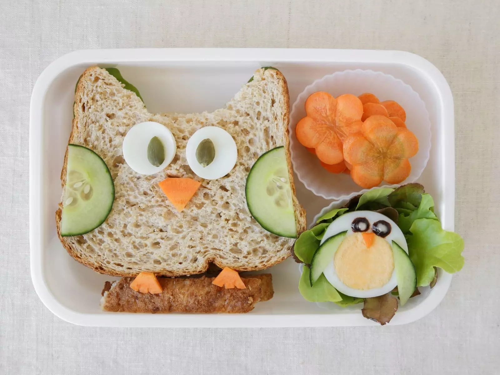 - Veggies: baby carrots, celery sticks, cucumbers, bell pepper strips, salad, cherry tomatoes, broccoli, snap peas, sweet potato
